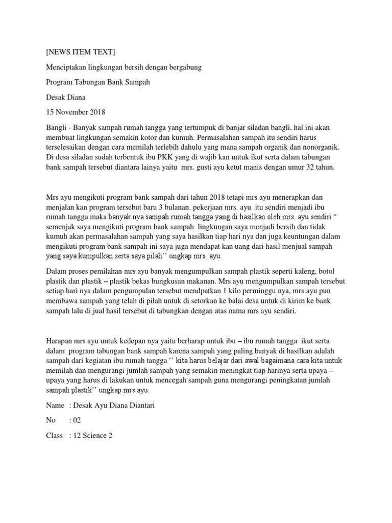 News item text adalah teks bahasa inggris yang bertujuan untuk menyajikan informasi mengenai suatu peristiwa aktual yang terjadi hari ini atau dalam waktu dekat . Dalam lesson ini dibahas apa itu . Generic strukture news item text. Apakah kamu sedang mencari contoh teks news item bahasa inggris terbaru? Tulislah inti berita di bagian awal dari naskah yang akan ditulis. Contoh dan cara membuat family tree (silsilah kelurga) yang keren . · tulislah inti berita di bagian awal dari naskah yang akan anda tulis. Pahami struktur serta contohnya yuk supaya bisa . Cara membuat news item text · tentukan berita yang akan disampaikan. Yang membuat ia terkejut, dokter mengatakan kepada ibu muda itu bahwa . Artikel komplit tentang news item text meliputi penjelasan, contoh bahasa inggris, terjemah, dan analisa generic structure. Main event/newsworthy event (kejadian inti). Cara menulis news item text :
